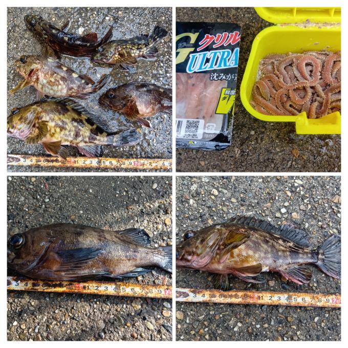 開門からカサゴ6匹、アイナメ1匹(タモですくって)でした。カサゴは赤イソメよりもエビに反応してました。